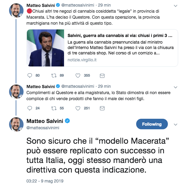A poche ore dalle dichiarazioni contro la cannabis light del vicepremier leghista Matteo Salvini, nelle Marche due negozi che vendono la cannabis legale sono stati chiusi per ordine del questore di Macerata. E intanto Salvini ha annunciato per la giornata di oggi la diramazione di una direttiva per avviare più controlli in questi negozi.