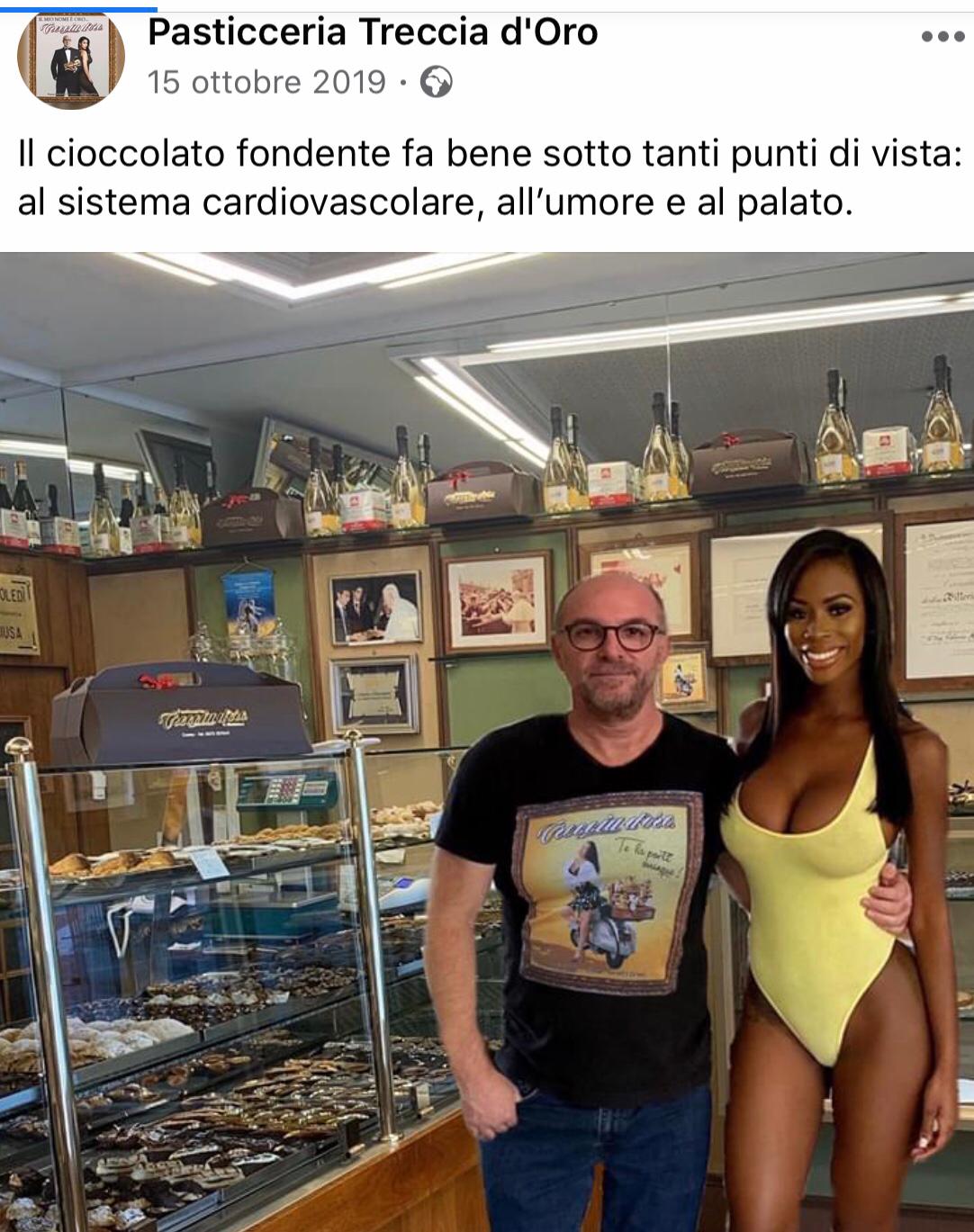 Una pagina che mi ha lasciata di stucco, perché mi è sembrato di tornare agli anni Ottanta dei culi sui manifesti e dei gelati leccati con voluttà da bocche col rossetto rosso. Forse peggio, perché almeno quelli avevano grafiche professionali mentre qui c’è il cattivo gusto, la mercificazione del corpo femminile uniti a un corso base di photoshop, lasciato alla prima lezione. Le foto e i fotomontaggi sono terribili: il dolce montato con photoshop su ragazze seminude, tra le gambe, tra le tette, cannoncini e bocche aperte, una ragazza di colore in costume abbracciata al titolare Gianpietro Maccalli e “Il cioccolato fondente fa bene”, una tizia in bikini e “Dopo la brioche tutti in spiaggia” e così via.
