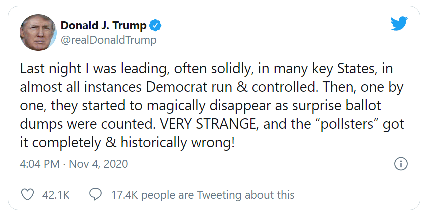 Ore 16,05 – Trump: “La scorsa notte ero in vantaggio, poi magicamente scomparso. Molto strano”. “La scorsa notte ero in vantaggio, spesso in modo solido, in molti stati chiave in quasi tutti i casi gestiti e controllati dai democratici. Poi, uno ad uno, hanno iniziato a scomparire magicamente mentre venivano contati i voti a sorpresa. MOLTO STRANO”. Lo ha scritto su Twitter il presidente Usa Donald Trump.