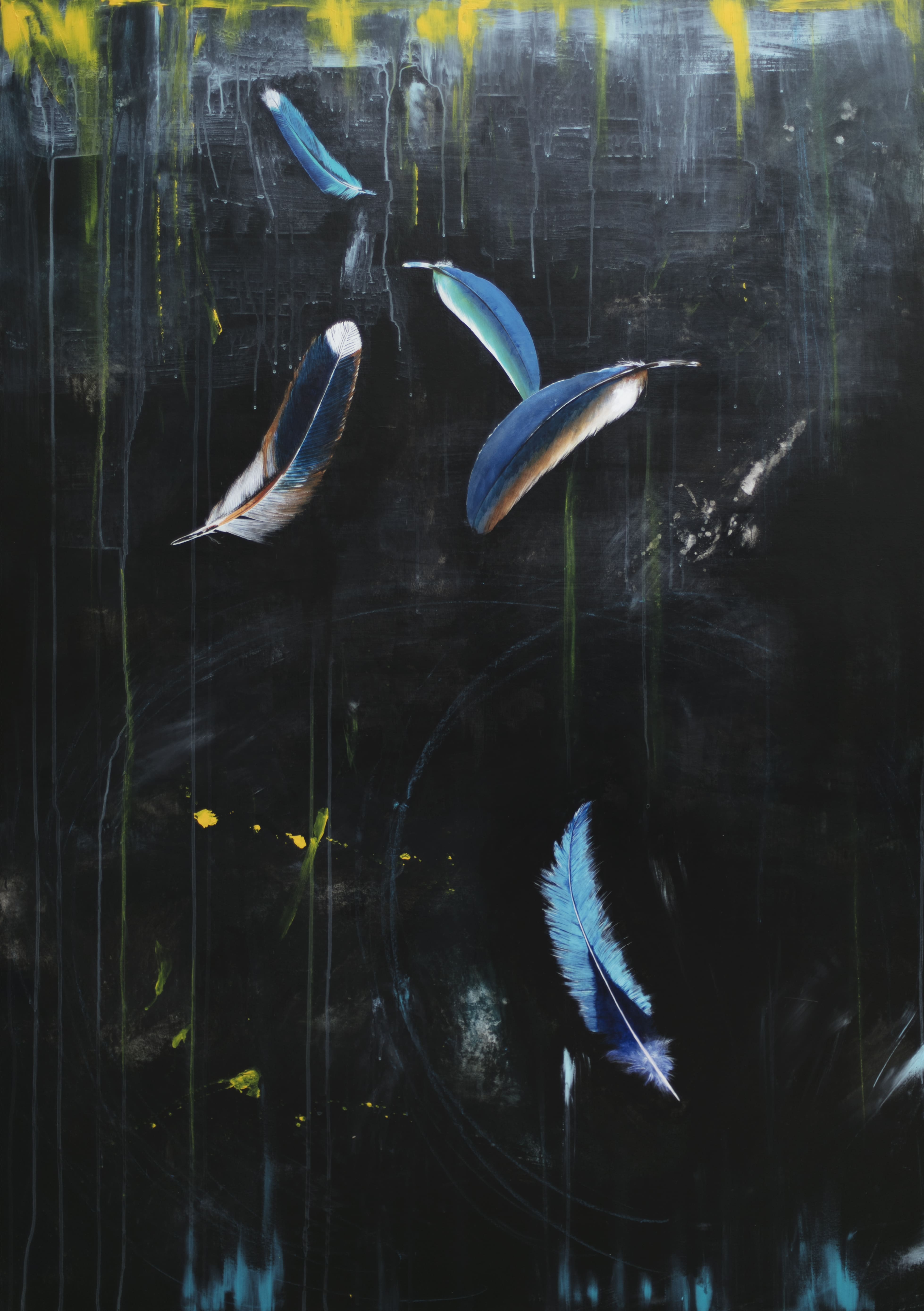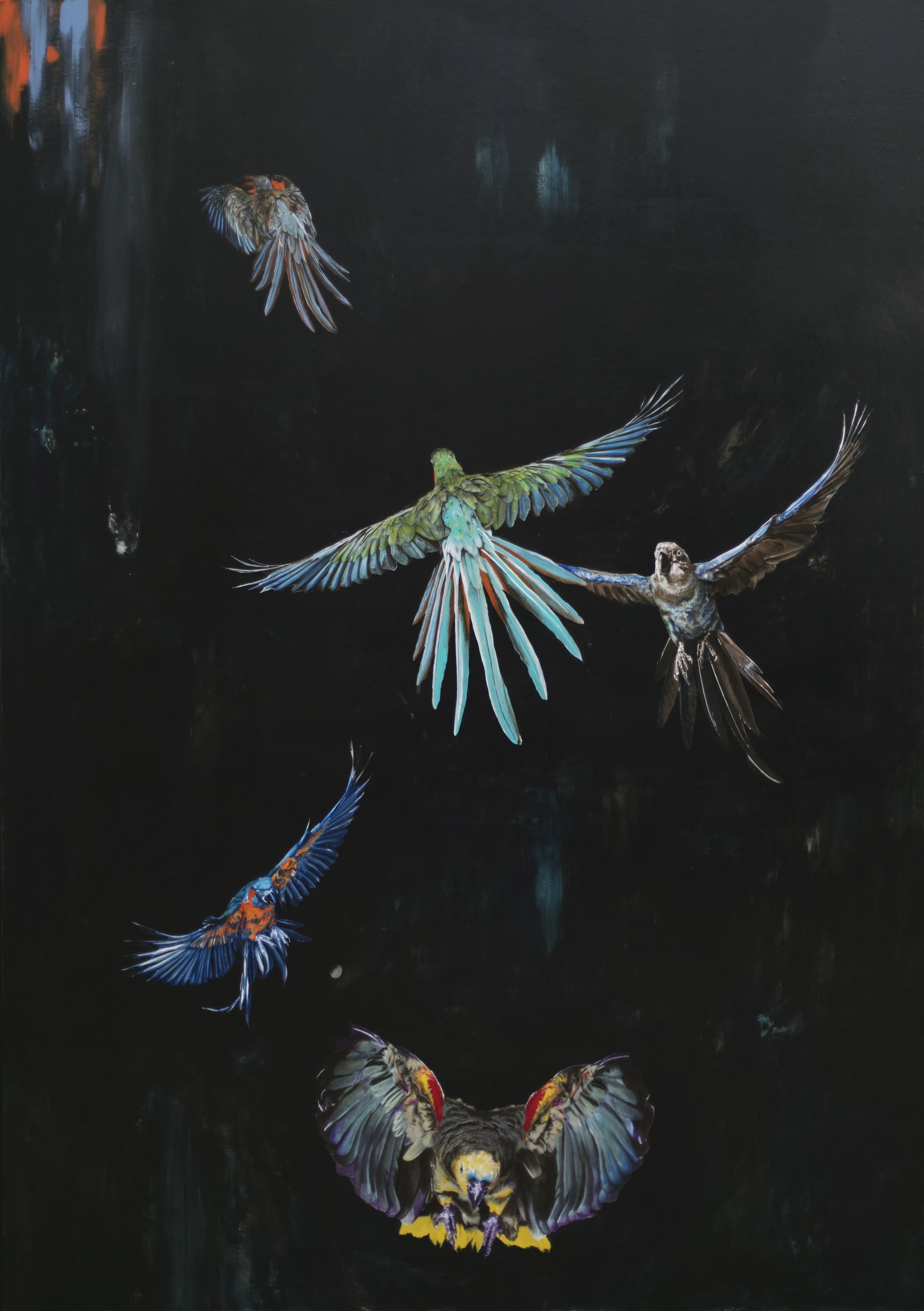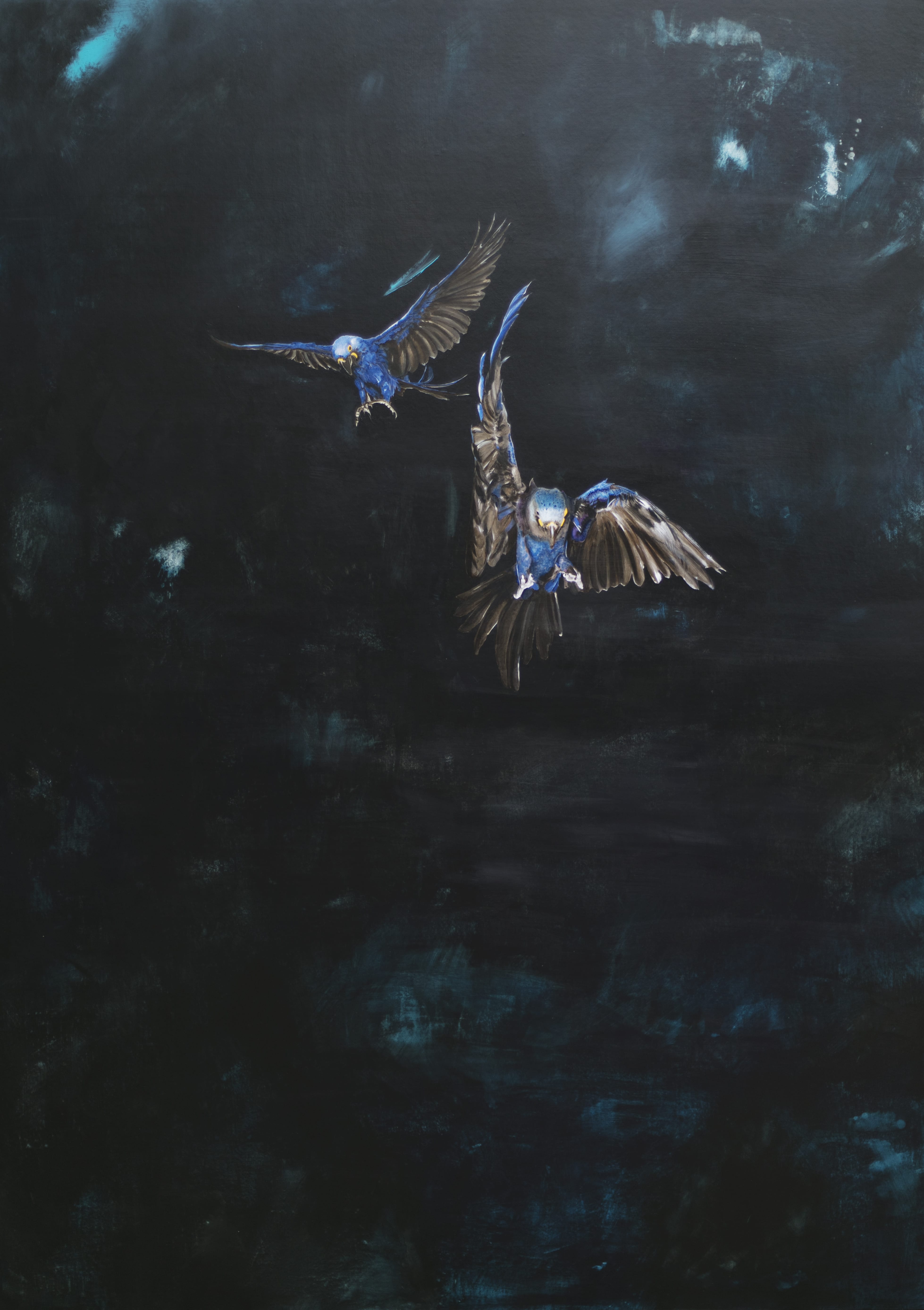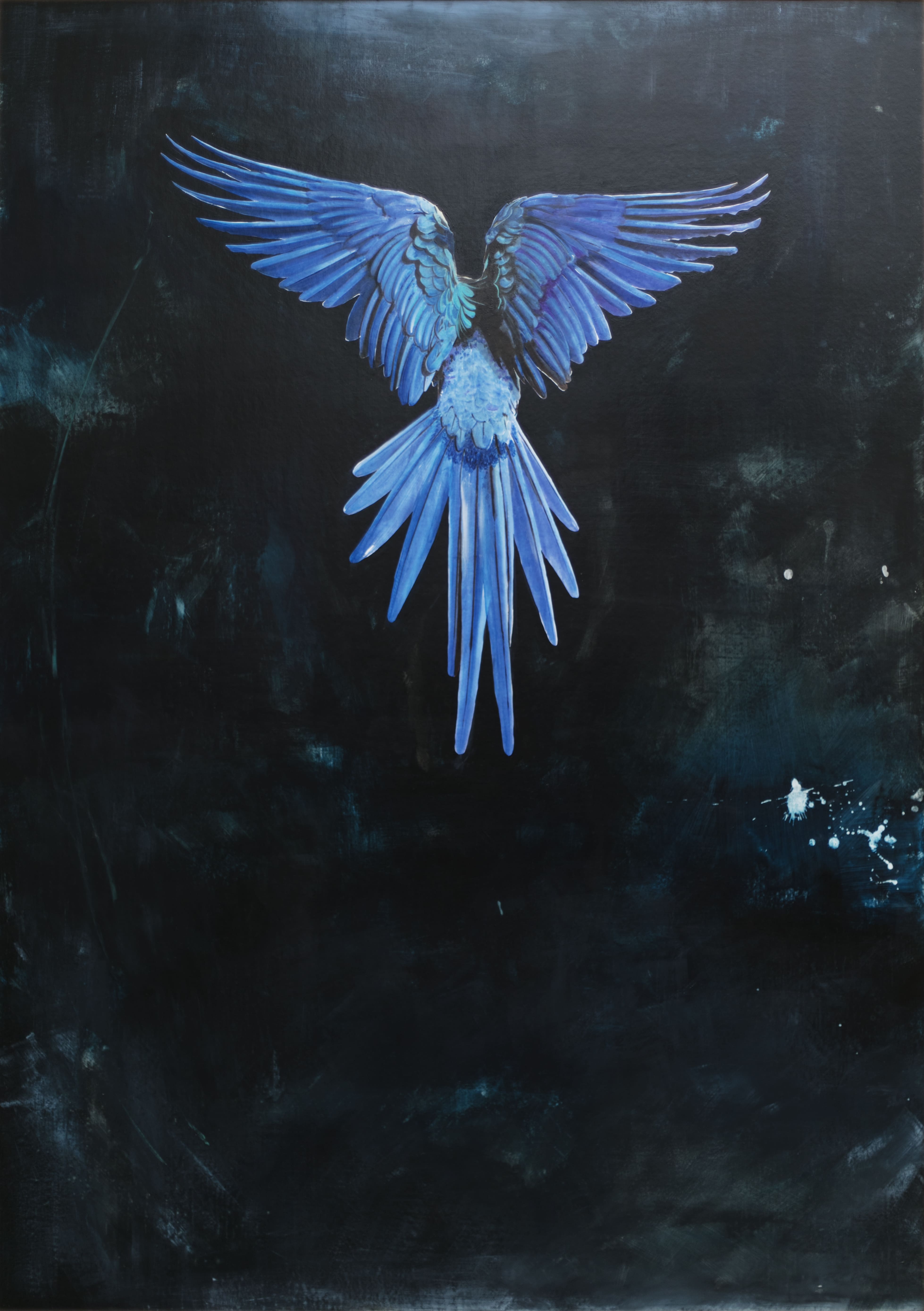 Due sono gli elementi che emergono dai dipinti dell’artista milanese, un uomo, a simboleggiare il genere umano in tutta la sua forza e aggressività, e un uccello, allegoria della libertà.