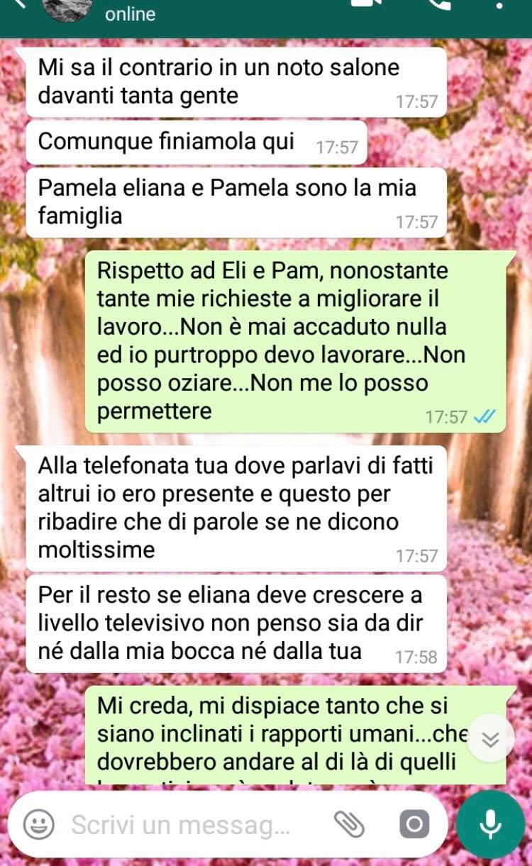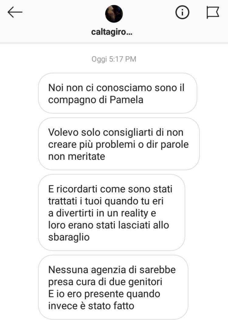 “Non so chi possa esserci dietro questo profilo Instagram. In un certo modo tale Mark Caltagirone mi disse: “Non ci sonosciamo, sono il compagno di Pamela. Volevo solo consigliarti di non creare più problemi o di dire parole non meritate. Ricordati come sono stati trattati i tuoi quando eri a divertirti in un reality. Nessuna agenzia si sarebbe presa cura dei tuoi genitori. Non si sputa dover si mangia“. Poi ha continuato scrivendo, tra le tante cose: “Ti chiedo da questo momento di tacere su agenzia e loro tre. Spero prenderai questo consiglio da uno che di pagare tre avvocati non gli frega nulla, ma che ne farebbe a meno”.