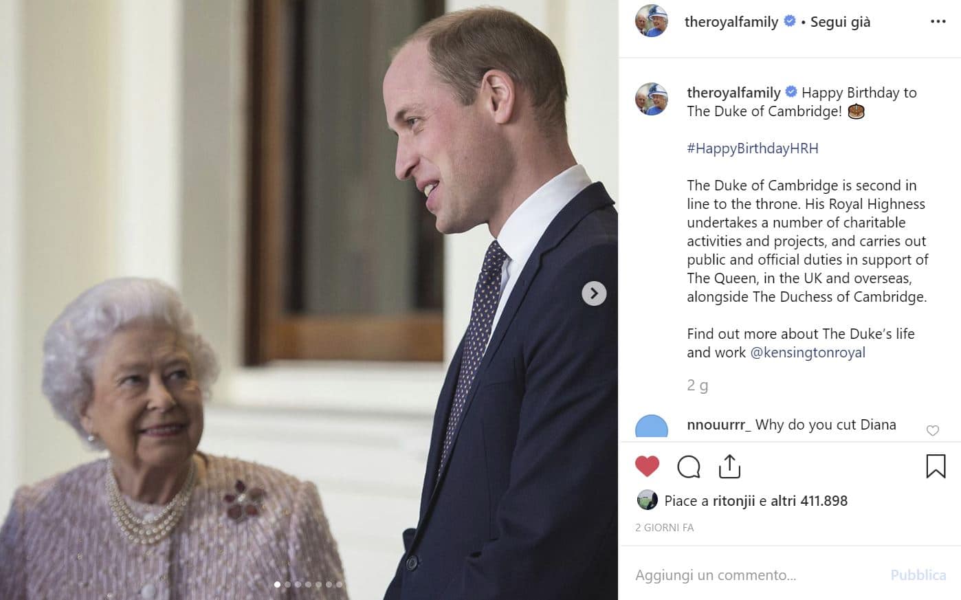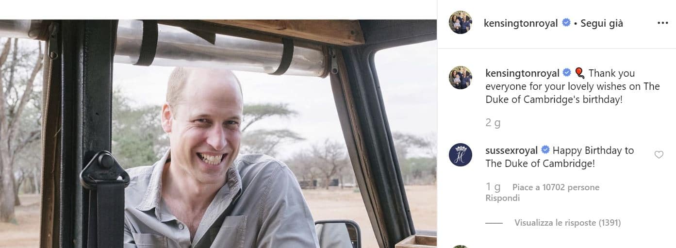 Mentre tutti i familiari più stretti hanno pensato a un post specifico per gli auguri al principe, Harry e Meghan hanno deciso di “limitarsi” a lasciare un commento sotto alla foto con cui l’account di William e Kate ha ringraziato i tanti che auguravano buon compleanno al principe.