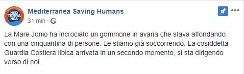 “La nave ha incrociato un gommone in avaria che stava affondando con una cinquantina di persone. Le stiamo già soccorrendo. La cosiddetta Guardia Costiera libica arrivata in un secondo momento, si sta dirigendo verso di noi”.