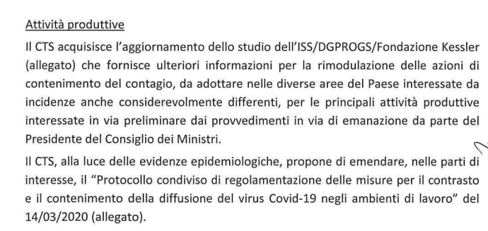 Nel verbale n.49 del 9 aprile 2020 il Comitato tecnico-scientifico si esprime sulle misure di allentamento del lockdown e sulle procedure da seguire per la riapertura delle attività produttive, commerciali, scolastiche, formative e così via. Nella fattispecie, per le attività produttive, il CTS dispone: