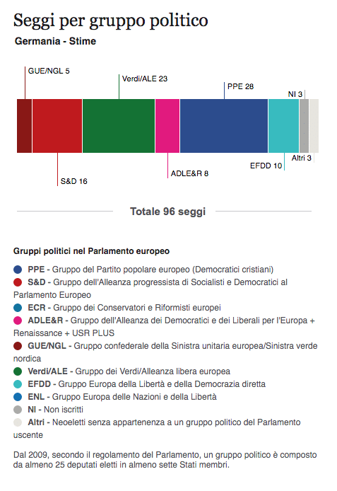 Alle elezioni del 2014 la CDU/CSU era in testa con 32 seggi e il 35 per cento delle preferenze, seguito da SPD con 27 eurodeputati al 27 per cento; i Verdi con 11 seggi all’11 per cento; la Sinistra con 7 seggi e il 7 per cento delle preferenze; sempre 7 erano gli eurodeputati di Afp.