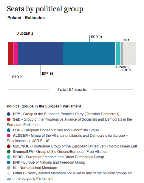 Nel 2014 la Polonia aveva visto un pareggio tra i seggi conquistati da Piattaforma Civica, partito di centro destra europeista, e Diritto e Giustizia, con 19 seggi ciascuno. Al terzo posto l’alleanza di sinistra.