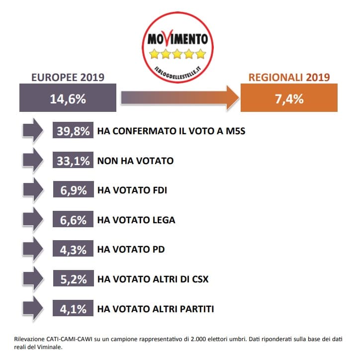 Secondo l’Istituto Cattaneo, che ha già analizzato i flussi per quel che riguarda le città di Perugia e di Terni, nel capoluogo di regione ieri non è andato a votare la metà degli elettori che avevano scelto il M5S alle Politiche 2018. Avrebbe invece votato la Lega a Perugia circa un quinto dell’originario bacino del Movimento. Questo dato è pari al 3,6 per cento dell’intero corpo elettorale ed è una quota perfino superiore a chi ha confermato il proprio voto al Movimento. Dal’Istituto Cattaneo infine definiscono “solo marginale” il flusso di voti dal Movimento 5 Stelle al Partito Democratico.