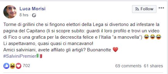 “Torme di grillini che si fingono elettori della Lega si divertono ad infestare la pagina del Capitano (li si scopre subito: guardi il loro profilo e trovi un video di Fico o una grafica per la decrescita felice e l’Italia “a manovella”) Li aspettavamo, quasi quasi ci mancavano! Amici salviniani, avete affilato gli artigli? Buonanotte”, scrive Morisi.