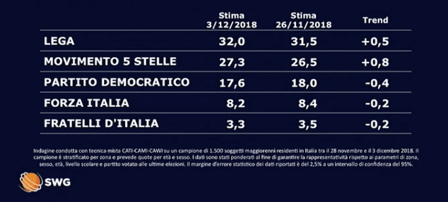 Tra Lega e Movimento Cinque Stelle c’è una distanza di 4 punti percentuali. È quanto emerge da un sondaggio realizzato in data 30 novembre 2018 dall’istituto Demopolis per il programma televisivo Otto e Mezzo, in onda su La7. Il partito guidato da Matteo Salvini continua a essere la prima forza politica del Paese con un consenso pari al 32 per cento, a fronte del 28 per cento del M5S.