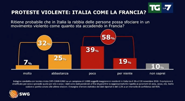 Oltre al consenso dei partiti, il sondaggio elettorale condotto per il TgLa7 questa settimana ha testato anche un altro sentimento degli italiani, in particolare quello rispetto alle rivolte dei gilet gialli in corso in Francia.