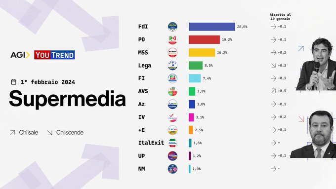 SONDAGGI POLITICI ELETTORALI – Perdono quota quasi tutti i partiti, mentre l’Alleanza Verdi/Sinistra guadagna terreno e scavalca Azione. È quanto emerge dall’ultima Supermedia YouTrend/Agi, calcolata sulla base delle rilevazioni dei principali istituti di sondaggio. La media del 1° febbraio vede Fratelli d’Italia ancora saldamente al comando, con il 28,6 percento, 0,1 punti percentuali in meno rispetto alla Supermedia di due settimane fa. Nello stesso periodo si sono anche ridotti i consensi di Partito democratico, Movimento 5 stelle e di quasi tutti i partiti: i dem sono scesi al 19,2 percento (-0,1%) mentre i pentastellati hanno perso 0,2 punti, scendendo al 16,2 percento. Stesso trend per la Lega, all’8,5 percento (-0,3%) e Forza Italia, al 7,4 percento (-0,1%), mentre l’Alleanza Verdi/Sinistra guadagna 0,5 punti e balza al sesto posto con il 3,9 percento. Superata così Azione, al 3,8 percento (-0,1%), ancora davanti a Italia viva, al 3,1 percento (-0,2%). Seguono +Europa al 2,5 percento (+0,1%), Italexit, ancora all’1,6 percento, Unione popolare, all’1,2 percento (-0,1%) e Noi moderati, all’1 percento.