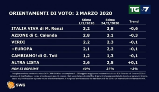 SONDAGGI POLITICI ELETTORALI – Nel pieno dell’emergenza coronavirus il sondaggio realizzato da Swg e diffuso ieri sera, lunedì 2 marzo, dal TgLa7 registra una perdita dei consensi della Lega a vantaggio di Fratelli d’Italia. Novità anche a sinistra, con Sinistra italiana/Mdp che sorpassa Italia Viva scesa al 3,2 per cento.