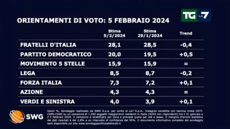 Sondaggi politici elettorali oggi 7 febbraio 2024: il Pd raggiunge il 20%, il distacco da FdI scende a otto punti