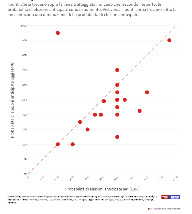 Nel grafico elaborato da YouTrend, i punti che si trovano sopra la linea tratteggiata indicano che, secondo l’esperto, le probabilità di elezioni anticipate sono in aumento. Viceversa, i punti che si trovano sotto la linea indicano una diminuzione della probabilità di elezioni anticipate.