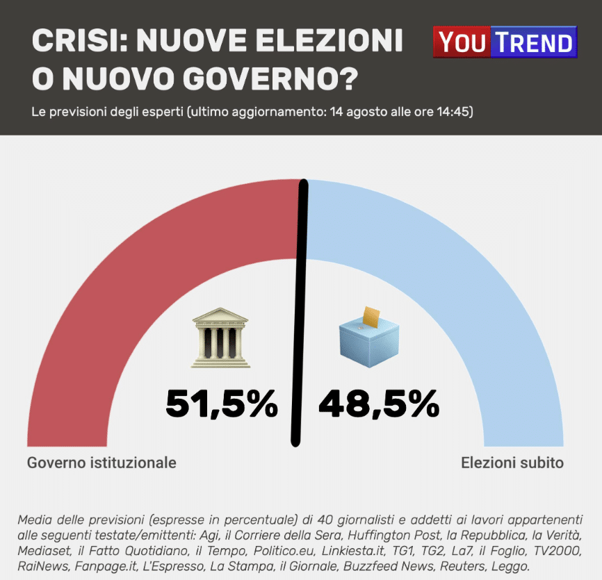 Negli ultimi sondaggi, rispetto a ieri, la crisi di governo sembra avere meno chance di portare a elezioni anticipate. La diminuzione potrebbe sembrare poco significativa rispetto alle percentuali del 14 agosto (50,2 vs 49,8).