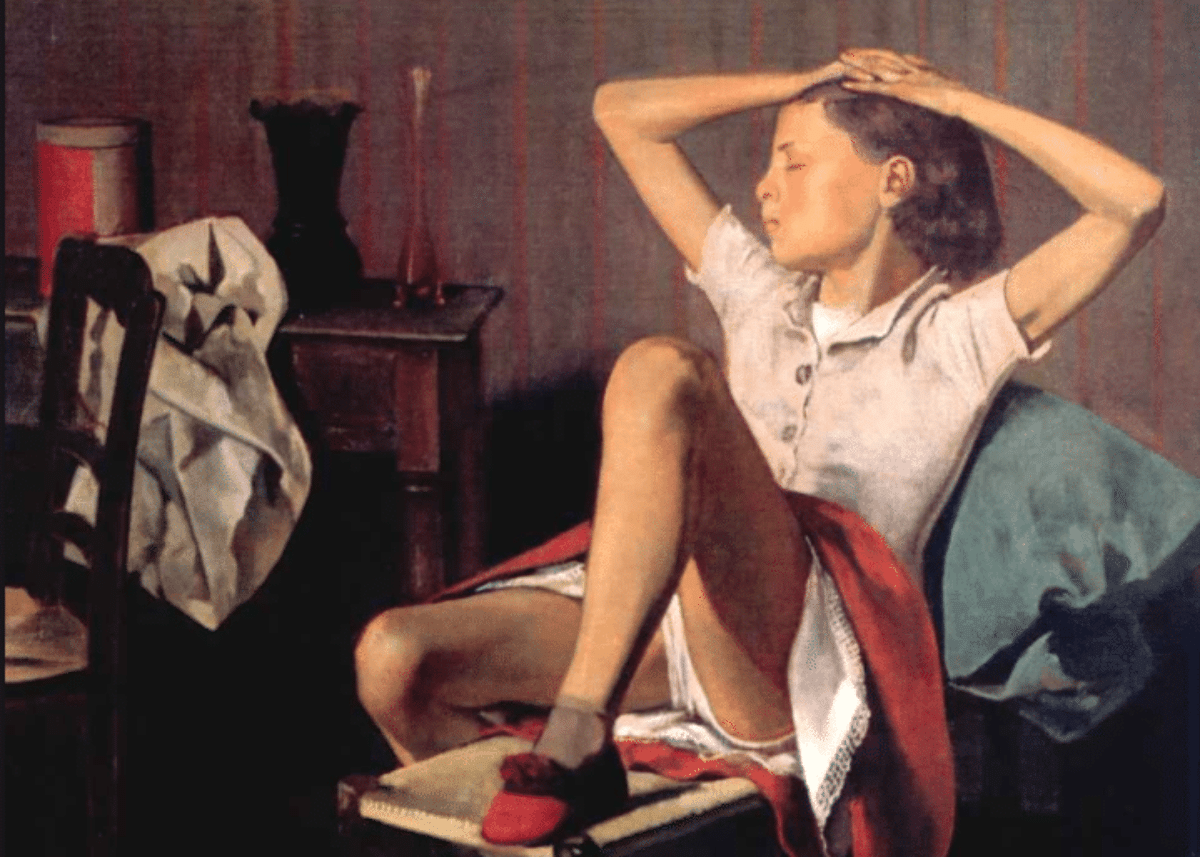 Il pittore francese di origini polacche, noto con lo pseudonimo di Balthus, ha realizzato nel 1938 questo quadro, in cui ritrae una giovane adolescente su una sedia che si sporge all’indietro mostrando la biancheria intima. Balthus è celebre per i suoi dipinti carichi di erotismo.