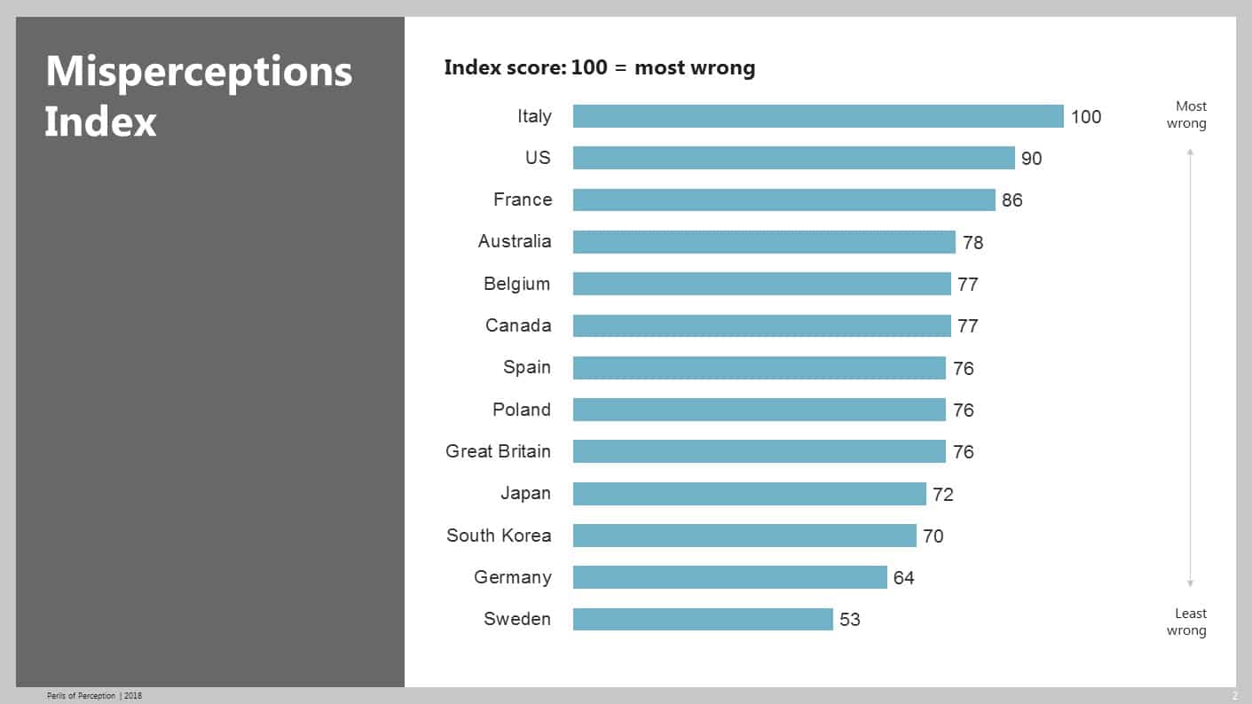 La nazione che più distorce i fatti è l’Italia. È quanto emerge da uno studio condotto da Bobby Duffy, il direttore della sezione inglese dell’istituto di ricerca Ipsos. sondaggi percezione italia