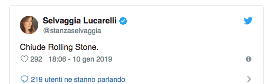 La prima persona a dare la notizia della chiusura del mensile è stata l’opinionista Selvaggia Lucarelli che, su Twitter, giovedì 10 gennaio ha scritto: “Chiude il Rolling Stone”. La Lucarelli, ora firma de Il Fatto Quotidiano, un tempo è stata la direttrice della rivista.