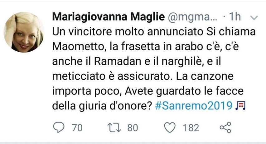 La giornalista, a cui per decisioni del governo giallo-verde, tra le polemiche, potrebbe essere affidata la striscia oraria che fu di Enzo Biagi, ha scritto: “Un vincitore molto annunciato Si chiama Maometto, la frasetta in arabo c’è, c’è anche il Ramadan e il narghilè, e il meticciato è assicurato. La canzone importa poco, Avete guardato le facce della giuria d’onore?”.