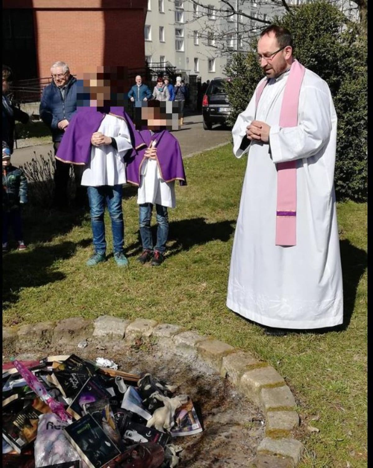 Nelle immagini del falò che si è svolto nella cittadina di Koszalin si vedono due preti in chiesa che impugnano una cesta piena di libri e che poi si incamminano verso un giardinetto. Subito dopo vengono appiccate le fiamme di fronte a due chierichetti.