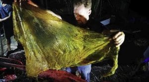 “Non ero preparato ad una quantità di plastica del genere”, ha detto Blatchley. “Dalla pancia del cetaceo sono stati tirati fuori circa 40 chili di sacchi di riso, buste della spesa, sacchi per piantagioni di banane e sacchi di plastica in generale: sedici sacchi di riso in totale”.