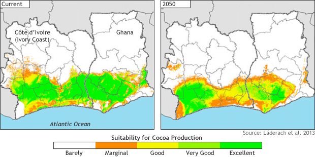 In questa illustrazione vengono mostrate le aree più adatta alla coltivazione oggi e nel 2050 in Ghana e Costa d’Avorio.