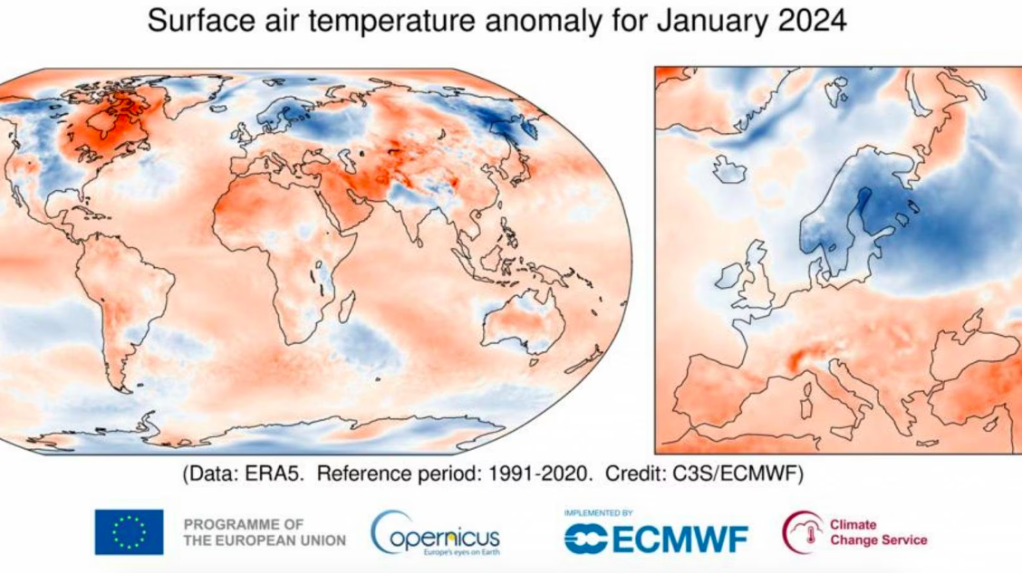 Tra febbraio ’23 e gennaio ’24, la temperatura media globale è aumentata di 1,52 gradi. Gennaio 2024, inoltre, è stato il più caldo mai registrato a livello globale, con una temperatura media dell’aria di 13,14 gradi, pari a 0,70 gradi sopra la media 1991-2020 di gennaio e +0,12 gradi rispetto alla temperatura del precedente record (gennaio 2020).