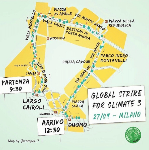 Qui la mappa con il percorso nella città di Milano, pubblicata dalla pagina Instagram del gruppo Friday for future Milano: