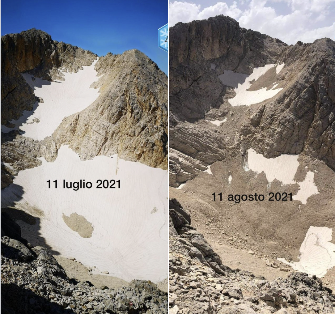 Un esempio? Il Ghiacciaio del Calderone, unico dell’Appennino, situato sul massiccio del Gran Sasso, in Abruzzo, è “ormai divenuto un autentico ‘ghiacciaio nero'”, cioè “detritico”, rileva l’associazione meteorologica AQ Caput Frigoris, che sulla sua pagina Facebook, in un post dal titolo “Calderone: un mese da incubo”, mette a confronto una foto scattata l’11 agosto con una dell’11 luglio.