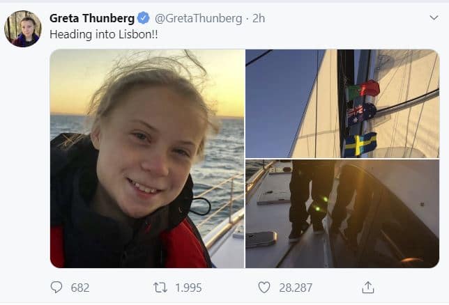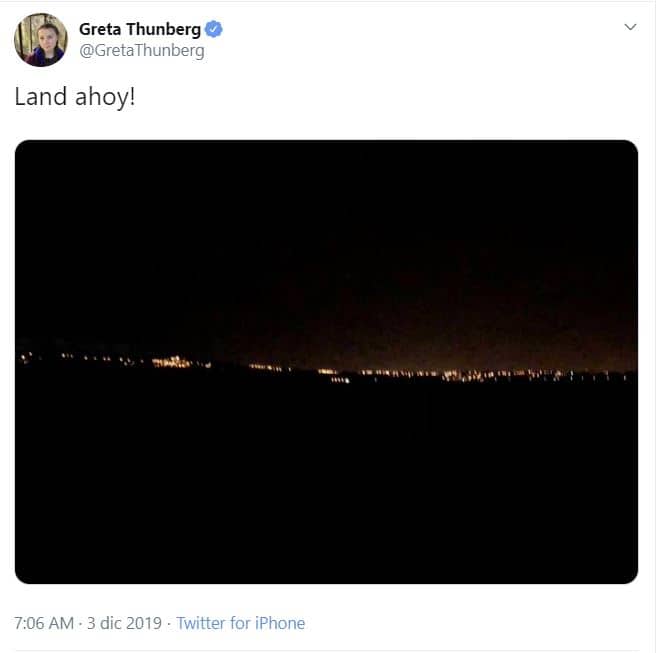 “Terra!”, così Greta Thunberg annuncia il suo arrivo in Europa dopo due settimane di traversata dell’Oceano Atlantico in catamarano.