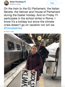 “Sul treno verso il Parlamento europeo, il Senato italiano, il vaticano e la House of Parliament durante le vacanze di Pasqua. E venerdì parteciperò allo sciopero delle scuole a Roma”, ha scritto Greta su Twitter. “So che è vacanza, ma la crisi climatica non va in vacanza e nemmeno noi”.