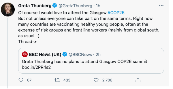 Da quando ha iniziato la sua protesta per il clima fuori dal parlamento di Stoccolma due anni e mezzo fa, la diciottenne ha partecipato a tutte le principali conferenze sull’ambiente. La Cop26 è già stata rinviata una volta a causa della pandemia di Coronavirus.