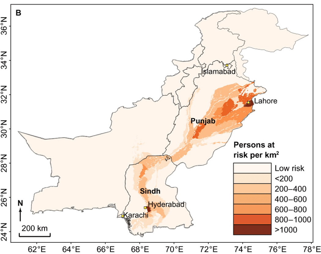 Lo studio ha rivelato inoltre come due delle più grandi città del Pakistan, Hyderabad nel sud e Lahore nel nord, sono quelle più a rischio. In queste aree urbane densamente popolate, ci sono oltre mille persone a rischio avvelenamento per ogni chilometro quadrato.