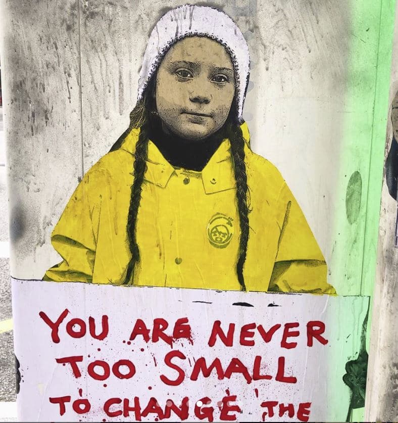 Nel murale di Tvboy, Greta e Trump appaiono uno accanto all’altro, e sull’iconico impermeabile giallo di Greta campeggia la scritta: “You are never too young to change the world”, “Non sei mai troppo piccoli per cambiare il mondo“, una delle sue frasi più memorabili.