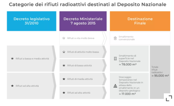Con il Decreto Ministeriale del 7 agosto 2015, poi, si è passati a una classificazione più articolata, in cinque categorie, che distingue tra rifiuti a vita molto breve (che si smaltiscono come quelli convenzionali), rifiuti di attività molto bassa e rifiuti di bassa attività (per un totale di 78 mila metri cubi, che saranno stoccati nel Deposito nazionale), rifiuti di media attività e di alta attività. In totale, la quantità di rifiuti radioattivi da smaltire è pari a circa 95 mila metri cubi.