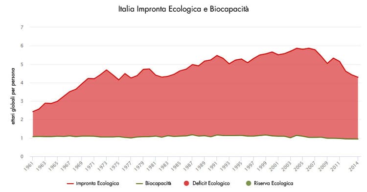 L’impronta ecologica degli italiani, secondo il Global Footprint Network, è di 4,3 ettari globali o gha.