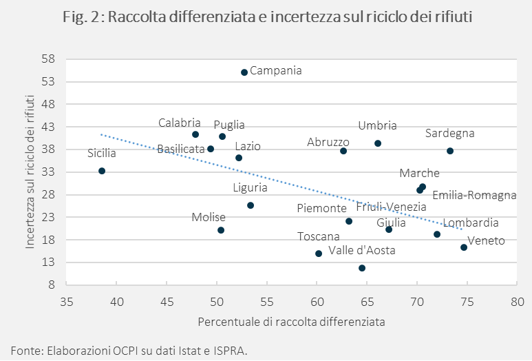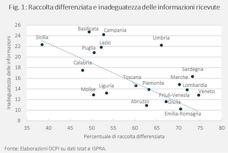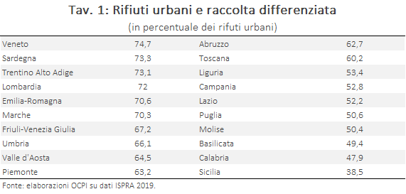 In un’ottica di transizione verso un’economia circolare, la raccolta differenziata svolge un ruolo importante. In Italia viene differenziato il 61% dei rifiuti urbani e ne viene riciclato il 51,3%: il dato è sopra la media dell'Unione europea. La differenziazione è però più elevata al Nord e Centro Italia: su queste differenze regionali influiscono principalmente il grado di informazione fornita ai cittadini, sia sul modo di attuare la differenziata sia sulla destinazione dei rifiuti, e gli orari di raccolta. Per aumentare il grado di differenziazione sono necessari più controlli e maggiore trasparenza da parte delle istituzioni
