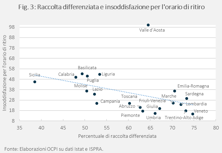 Un sondaggio Istat indica che quattro aspetti relativi al grado di soddisfazione nella raccolta dei rifiuti sembrano poter influire sul comportamento delle persone: nelle regioni che differenziano di più c’è maggiore soddisfazione sull’orario di ritiro, maggiore certezza che i rifiuti vengano poi riciclati e maggiore apprezzamento dell’informazione e assistenza ricevute (Tav.2 e figure 1,2,3).