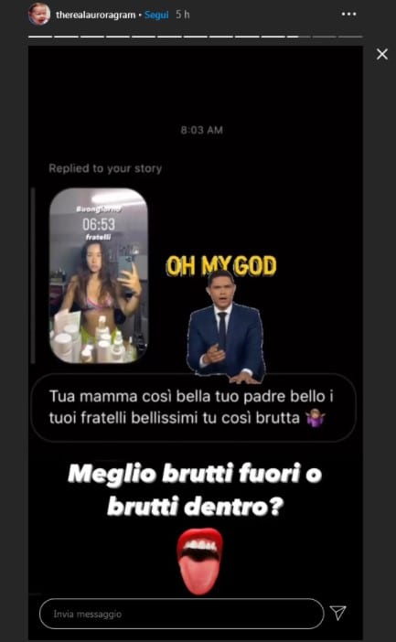 “Tua madre così bella, tuo padre è bello, i tuoi fratelli bellissimi e tu così brutta?”, ha scritto un utente. La figlia di Eros Ramazzotti e Michelle Hunziker ha pensato bene di non tenere per sé il messaggio poco dolce ricevuto, ma di condividerlo nelle sue storie Instagram, in modo da renderlo visibile a tutti. “Meglio essere brutti fuori o brutti dentro?”, è stata la risposta della ragazza, accompagnata da una faccina sorridente per sdrammatizzare.