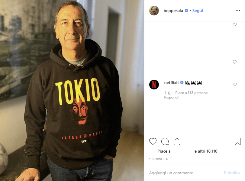 Beppe Sala si propone come nuovo personaggio de La casa di carta. Il sindaco di Milano, domenica 10 novembre 2019, ha pubblicato una foto di lui mentre indossa la felpa della fortunata serie tv con su scritto il nome della protagonista, “Tokio”, e la maschera di Salvador Dalì. Nella didascalia ha commentato “Ad ognuno la sua felpa” e poi, tra parentesi, ha aggiunto “io comunque sono pronto a fare Milano”.