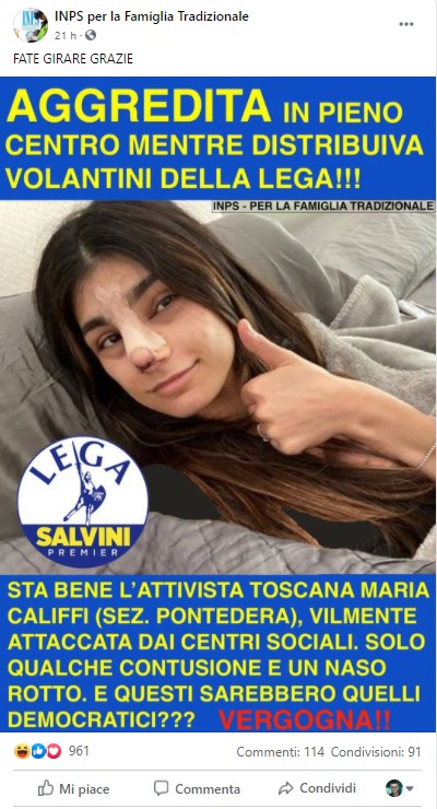 L’ex pornostar Mia Khalifa è stata spacciata per un’attivista della Lega picchiata dai centri sociali, una vera e propria bufala. Il meme è stato diffuso il 12 settembre 2020 alle ore 12,59 dalla pagina Facebook “Inps per la famiglia tradizionale”, palesemente fake e definita da alcuni “satirica”. In particolare si tratta di una foto dell’attrice con il naso incerottato e la didascalia: “Aggredita in pieno centro mentre distribuiva volantini della Lega!!! Sta bene l’attivista toscana Maria Califfi (sez. Pontedera), vilmente attaccata dai centri sociali. Solo qualche contusione e un naso rotto. E questi sarebbero quelli democratici? Vergogna!!”.