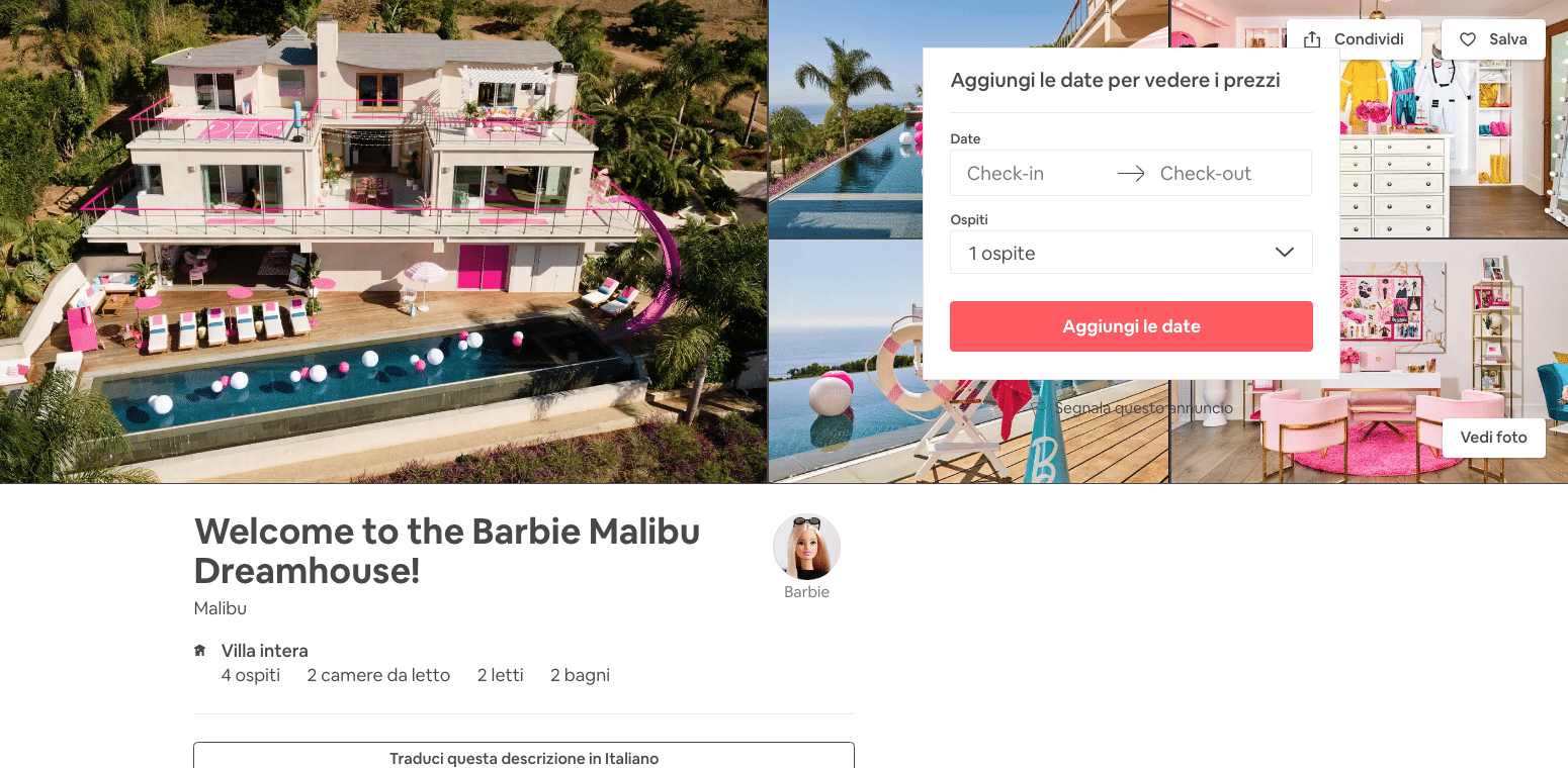 A partire dal 23 ottobre alle ore 20 è possibile prenotare la casa di Barbie su Airbnb. I 4 ospiti potranno fare il check in domenica 27 ottobre e il check out martedì 29 ottobre.
