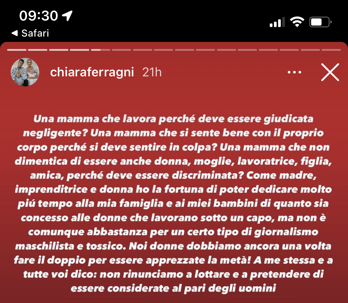 “Come madre, imprenditrice e donna ho la fortuna di poter dedicare molto più tempo alla mia famiglia e ai miei bambini di quanto sia concesso alle donne che lavorano sotto un capo, ma non è comunque abbastanza per un certo tipo di giornalismo maschilista e tossico. Noi donne dobbiamo ancora una volta fare il doppio per essere apprezzate la metà! A me stessa e a tutte voi dico: non rinunciamo a lottare e a pretendere di essere considerate al pari degli uomini”.
