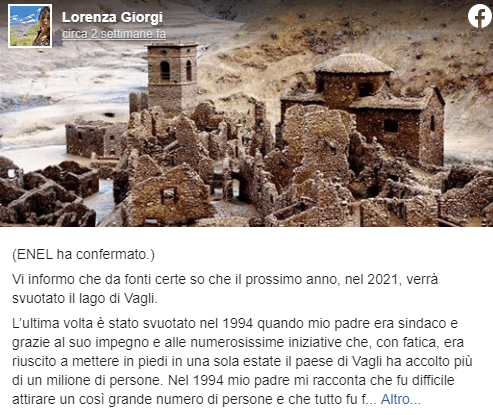 “Vi informo che da fonti certe so che il prossimo anno, nel 2021, verrà svuotato il lago di Vagli. L’ultima volta è stato svuotato nel 1994 quando mio padre era sindaco e grazie al suo impegno e alle numerosissime iniziative che, con fatica, era riuscito a mettere in piedi in una sola estate il paese di Vagli ha accolto più di un milione di persone”, ha spiegato Lorenza Giorgi su Facebook.