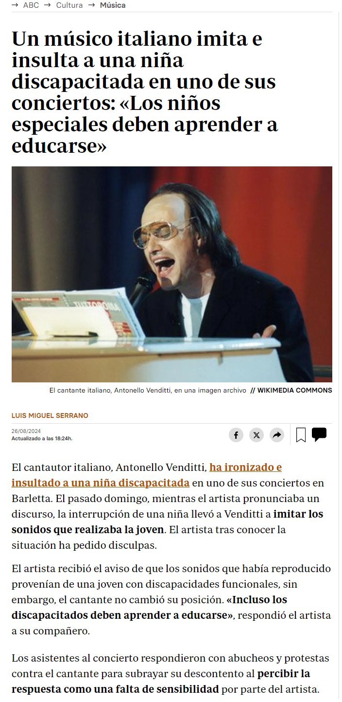 A corredo dell’articolo, dal titolo “Un músico italiano imita e insulta a una niña discapacitada en uno de sus conciertos”, è stata pubblicata non la foto di Antonello Venditti ma bensì quella di Corrado Guzzanti, che negli anni Duemila proponeva un’imitazione del cantautore nella trasmissione L’Ottavo Nano.