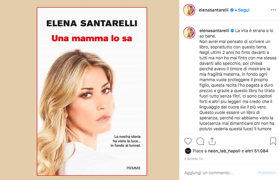 Elena Santarelli ha deciso di raccontare la malattia del figlio in un libro dal titolo “Una mamma lo sa”.