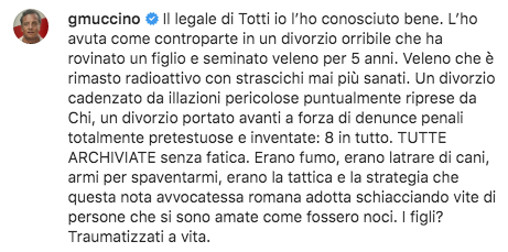 “Il legale di Totti (Annamaria Bernardini de Pace per l’appunto) io l’ho conosciuto bene. L’ho avuta come controparte in un divorzio orribile che ha rovinato un figlio e seminato veleno per 5 anni”.