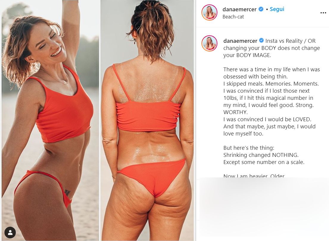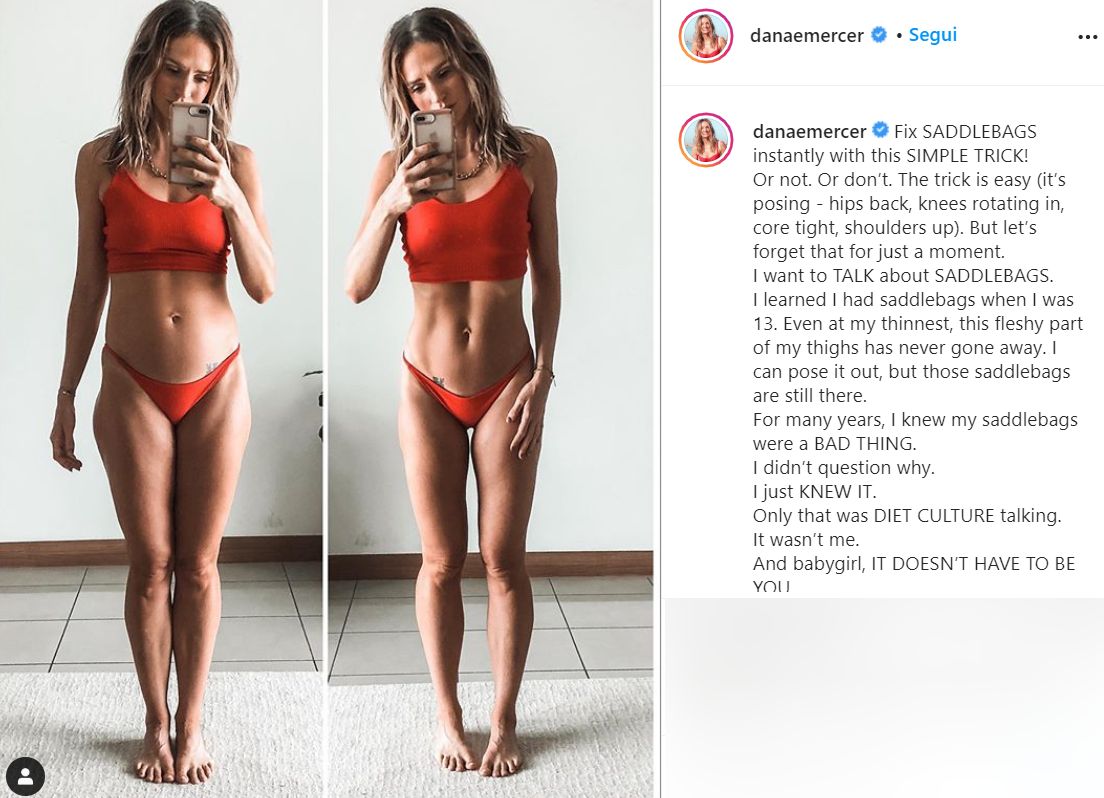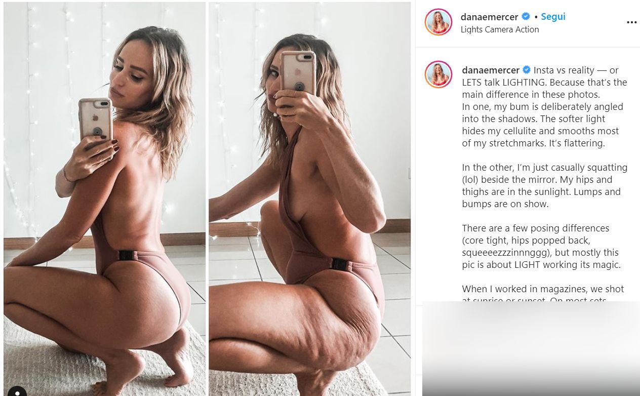Qual è il trucco più diffuso su Instagram per celare le imperfezioni? Sicuramente l’illuminazione, a detta di Danae Mercer. “La luce cambia la foto”, scrive. “All’ombra le imperfezioni si vedono meno, la luce dall’alto di mezzogiorno le illumina in modo crudele. La luce laterale diffusa da una finestra è la più lusinghiera per gli addominali ma di solito piuttosto cattiva sul viso. Ecco perché spesso vedrai un telefono che copre il volto. Ma voi siete fantastiche con ogni tipo di luce”. L’influencer, che vive a Dubai, ha voluto far luce sulle verità nascoste dai social, senza avere paura di mettere in mostra le proprie imperfezioni.