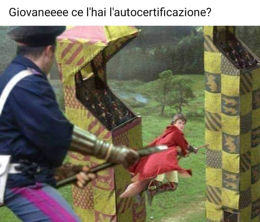 Un’altra divertentissima immagine, che circola solo da qualche ora sui social, è quella che vede un carabiniere in un campo di Quidditch (lo sport praticato da Harry Potter) intento a domandare ad un ragazzo che vola su una scopa se ha l’autodichiarazione.