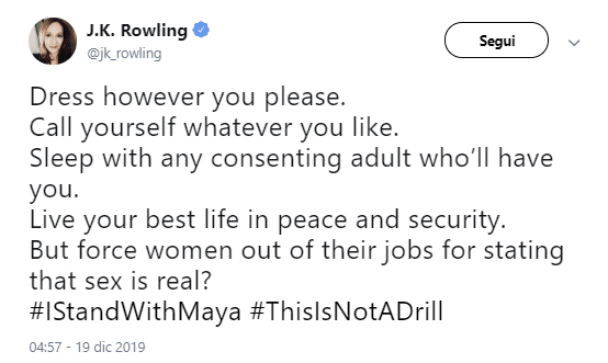 E, a suo favore, è intervenuta la Rowling che, poche ore dopo la sentenza, ha cinguettato: “Vestiti come vuoi, fatti chiamare come vuoi, vai a letto con qualunque adulto consenziente ti desideri, vivi la tua vita al meglio in pace e sicurezza. Ma si può davvero licenziare una donna per aver detto che il sesso è reale?”.